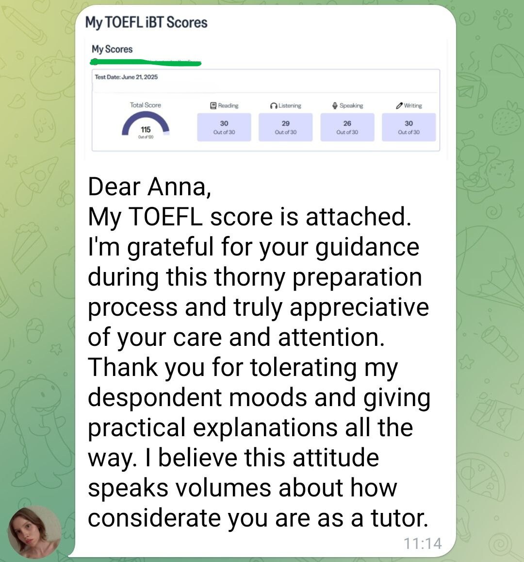 Результат обучения: все языковые требования выполнены: общий балл 110+ и 25+ баллов по каждой секции, общий балл высокий. Поступила в Кембриджский университет на юридический факультет.